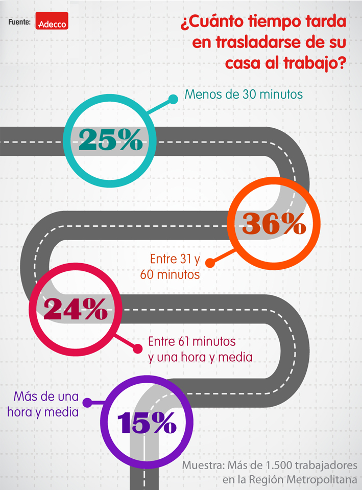 Un estudio reciente de la consultora Adecco reveló que casi un 40% de los chilenos requiere de más de 1 hora para llegar a su puesto de trabajo.