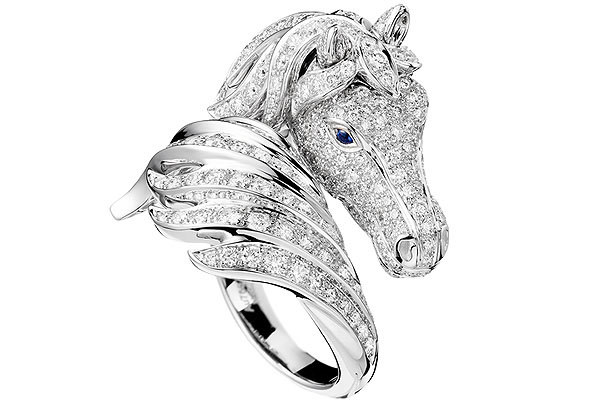A esta nueva edición se suman animales fantásticos como Pegaso, caballo alado que se funde en un fabuloso brazalete de oro blanco, y un sinfín de pájaros que se posan en pendientes y colgantes.