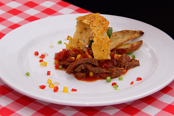 Sofreír la cebolla, el pimentón y los cubitos de zapallo italiano hasta que se doren apagar con vino tinto. Aparte selle las tiritas de carne una vez lista mezclar con el sofrito. Luego incorpore el tomate triturado en conserva y finalice incorporando el kétchup. Revuelva por algunos minutos y agregue un toque de pasta de ajo.