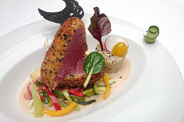 - Freír la porción de atún. Mientras se fríe, agregar en un plato la salsa de leche de coco, las verduras en juliana y el puré de topinambur previamente calentados.