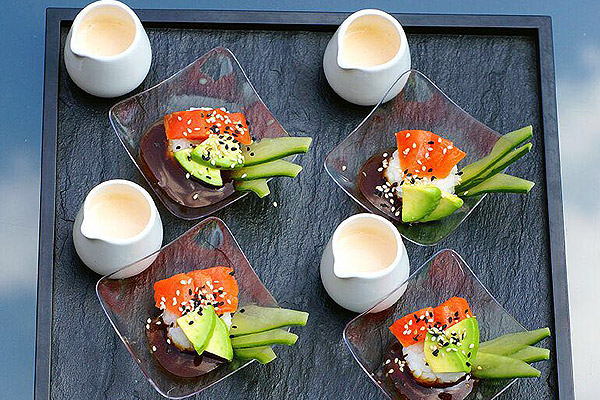 - Cortar el salmón ahumado en tiritas pequeñas y poner sobre el arroz de a 5g cada uno.