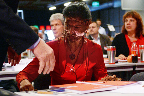 A finales de mayo la política del partido alemán poscomunista La Izquierda, Sahra Wagenknecht, recibió un pastel de crema en la cara durante el congreso de la agrupación en Magdeburg, en reproche por su postura frente al drama de los refugiados: Wagenknecht aseguró que Alemania no podía acoger a todos los refugiados que estaban llegando al país.