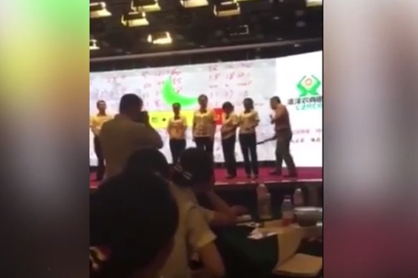 En la grabación se ve a ocho empleados -cuatro hombres y cuatro mujeres- alineados encima sobre un escenario y obligados a justificar por qué fueron los últimos en una competición, antes de ser golpeados por una especie de tabla que sostenía un supuesto trainer motivacional.