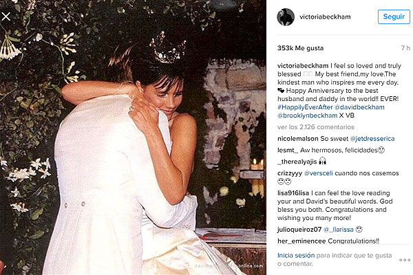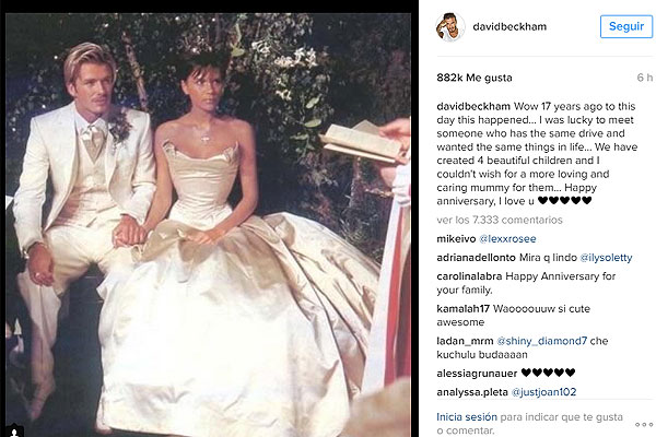 SANTIAGO.- "Wow, hace 17 años ocurrió esto... Tuve la suerte de conocer a alguien con la misma pasión y que quería las mismas cosas en la vida". Estas fueron las palabras con las que el ex futbolista David Beckham acompañó la fotografía que hoy publicó en su Instagram y que recuerda el día de su matrimonio con la ex Spice Girl Victoria.