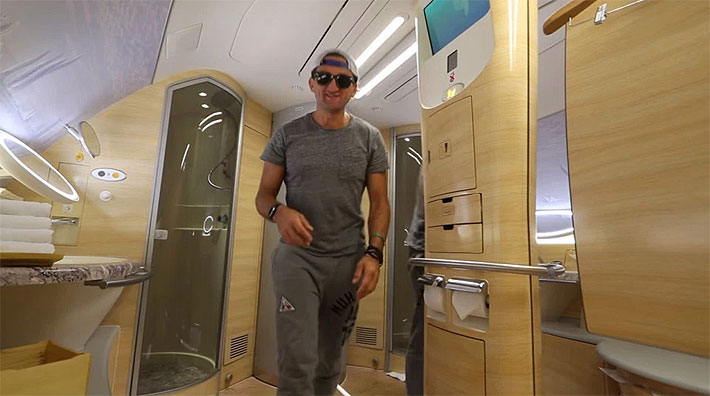 El vlogger camina por el baño de primera clase (Casey Neistat / Youtube)