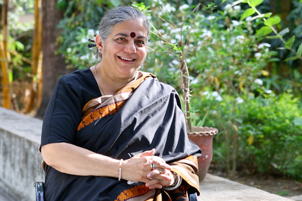 Vandana Shiva nos cuenta algo más de la historia del lugar donde tenemos esta conversación. “Aquí donde estamos es el lugar donde mi madre criaba las vacas, estas son ahora las oficinas de mi fundación, Navdanya. Aquí escuchaba música de los Beatles, en el establo, que en India está al interior de las casas”.