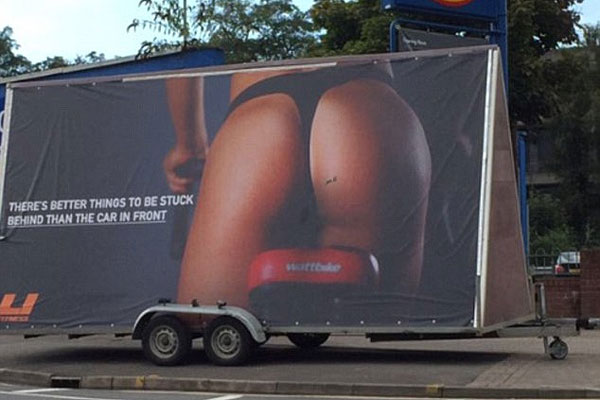 "Hay mejores cosas para estar atrapados detrás que el auto que va adelante", se lee en la gigantografía, junto a la imagen del trasero semidesnudo de una mujer que se ejercita en una bicicleta.