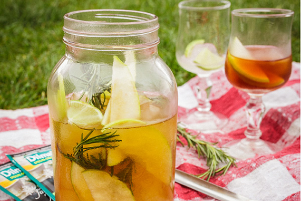 -750 ml de Moroccan Mint (ya infusionado y frío) -3 sachets de endulzante -80 ml de reducción de canela -40 ml de jugo de limón -1 manzana en rodajas -5 ramas de romero