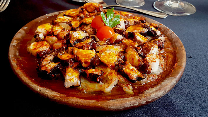 - Para emplatar, armar una cama de papas en el centro del plato con rodajas finas y cubrirla con otra capa de rodajas de pulpo. Por último, echar sal de mar, un chorro de aceite de oliva, y una mezcla de pimentón picante y dulce.