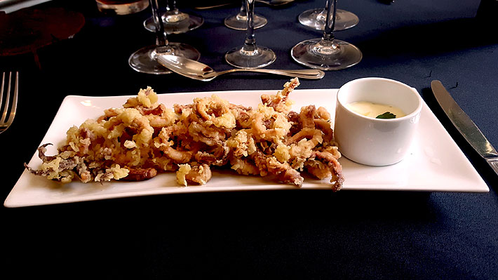 - Para emplatar: poner los calamares en un plato hondo de greda para conservar su temperatura. En un pocillo pequeño se echa el alioli adornado con una hoja de perejil. Colocar ambos pocillos sobre un plato base y agregar un limón cortado al lado.