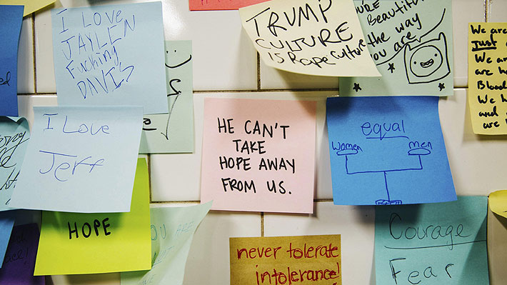 Aunque muchos de los mensajes están en inglés, los hay también en español, francés y otras lenguas, y la mayoría comparte un mismo sentimiento de rechazo a la elección de Trump y sus anunciadas políticas de deportación de inmigrantes, restricciones contra musulmanes o construir un muro en la frontera con México.