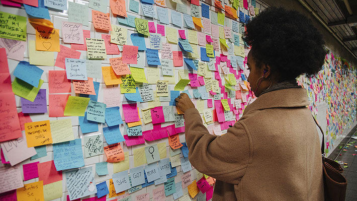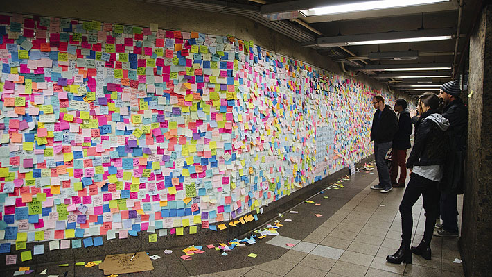 NUEVA YORK.- Mensajes de reivindicación, otros para levantar el ánimo, promover la unidad o el amor, o dirigidos contra el Presidente electo de EE.UU., Donald Trump, han abarrotado una gigantesca pared de una estación de metro de Nueva York.