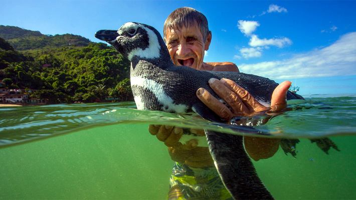 pingüino de Magallanes Dindim y su “padre adoptivo”, el jubilado brasileño João Pereira, quien rescató al ave el año 2011 tras encontrarla cubierta de petróleo y moribunda, en unas rocas de Río de Janeiro.
