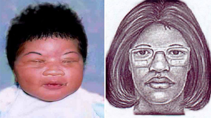 El robo de Kamiyah Mobley fue noticia nacional en su país, en 1998. A la izq., Mobley con solo horas de vida y a la der., el retrato hablado de Williams, su secuestradora.