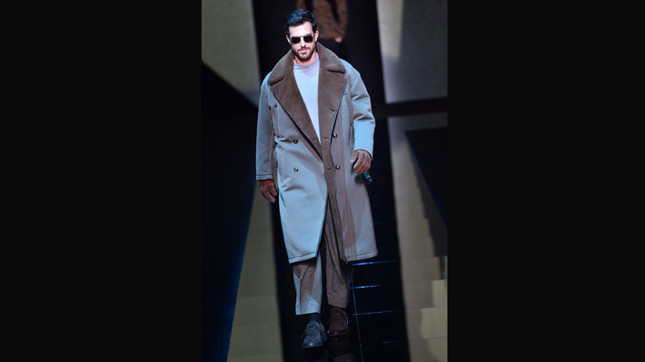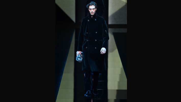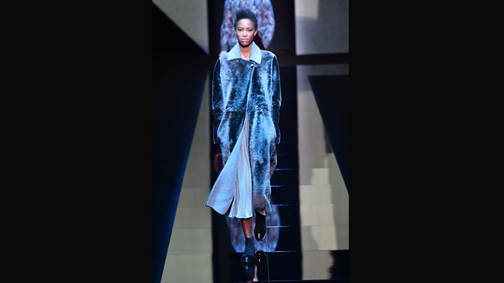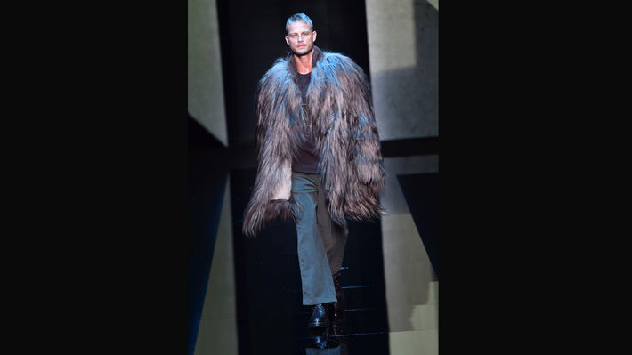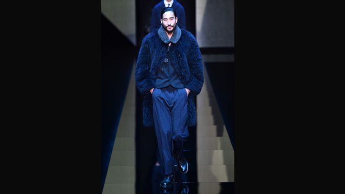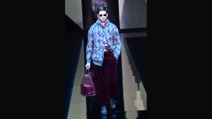 Para hombre, Armani optó por los abrigos gordos de pelo, pero también las chaquetas en piel y en texturas aterciopeladas.