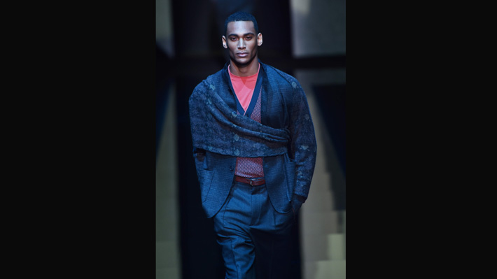 La casa del modisto nacido en Piacenza llevó hoy hasta la pasarela milanesa una colección de prendas masculinas compuestas fundamentalmente por bufandas con mangas, es decir, piezas capaces de proteger del frío el cuello y al mismo tiempo de cubrir los brazos.