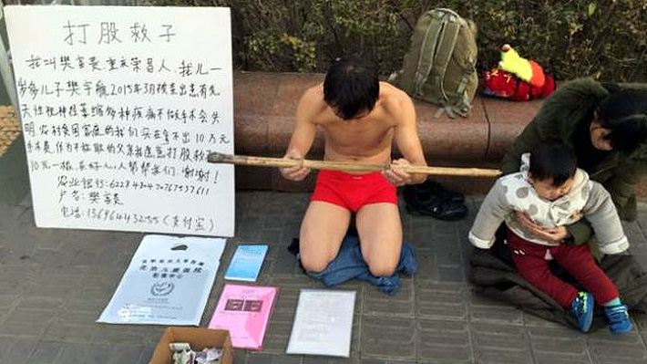 Pese a encontrarse en pleno invierno, Fan se arrodilló apenas protegido por su ropa interior, mientras su esposa y su hijo permanecían sentados a su lado. Con la cabeza gacha, ofrecía con los brazos alzados un palo, esperando que alguno de los transeúntes leyera su oferta en un cartel: “Golpee mis muslos para salvar a mi hijo”. El monto a pagar por cada golpe era de 10 yuanes (poco menos de mil pesos). Algunos pasaban y dejaban dinero, pero nadie se atrevió a pegarle.
