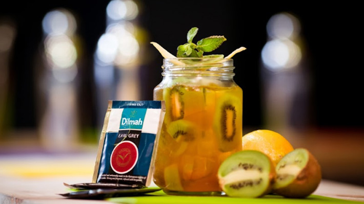 En un vaso con mucho hielo, agregar té Dilmah, limón y jugo de durazno. Mezclar con un poco de fruta.