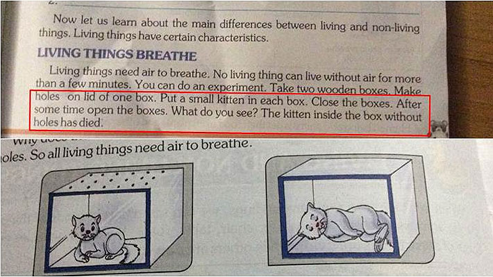El libro "Our Green World" (Nuestro Mundo Verde), que es utilizado por cientos de escuelas privadas en India, propone colocar a dos cachorros de gato en cajas separadas, una con agujeros y la otra totalmente hermética, con el fin de estudiar la importancia del oxígeno para los seres vivos.