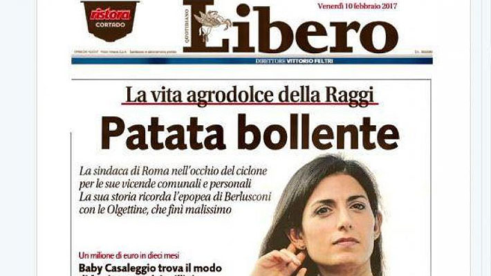 El diario conservador, dirigido por el periodista Vittorio Feltri, titula junto a una enorme foto de Raggi: "Patata Bollente" (Patata Caliente) con el objetivo de referirse a las dificultades de la alcaldesa, pero también haciendo uso del lenguaje vulgar que se refiere al órgano sexual femenino.