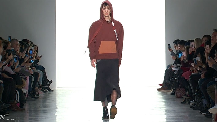 Difuminando la línea entre masculino y femenino, Luo envió a modelos hombres por la pasarela en vestidos sobre pantalones, y a mujeres con trajes de hombres. Hubo sudaderas y suéters con capuchas, y abrigos de dos tonos de corte perfecto.