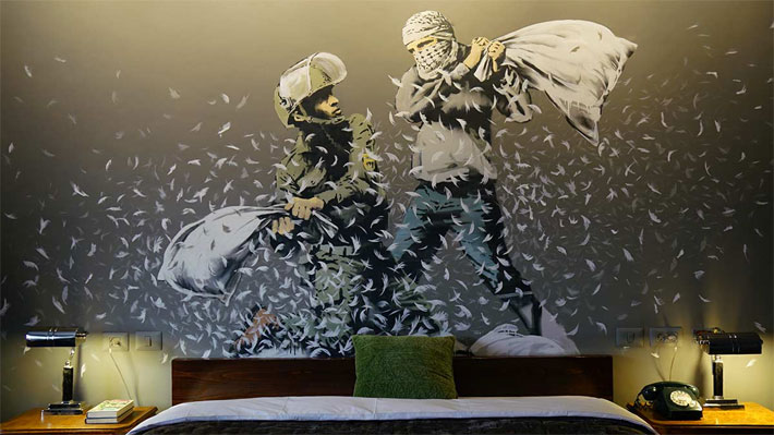El establecimiento, cuyo gerente es Wisam Salsaa, fue llamado The Walled Off Hotel (hotel amurallado) y cuenta con una habitación que lleva el nombre del artista callejero, y en cuyos muros aparece un soldado israelí y un palestino enfrascados en una guerra de almohadas.