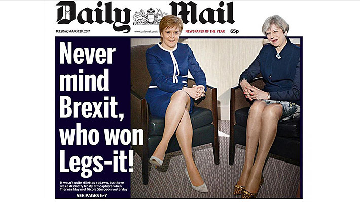 Sin embargo, Sarah Vine, columnista del Daily Mail y esposa del político conservador Michael Gove, prefirió omitir esos temas y referirse en cambio a las piernas de May y Sturgeon. Específicamente respecto a las de esta última escribió: "Más coquetas, tentadoramente cruzadas, un intento de seducción en vivo".