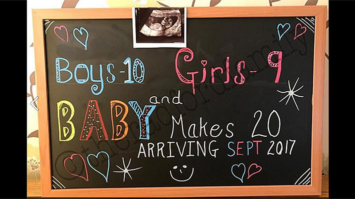 "Niños - 10; Niñas - 9 y el bebé hacen 20. Llegará en septiembre de 2017", fue el mensaje escrito en la pizarra y publicado en Facebook por Sue, que anunció al mundo que los Radford no paran de crecer.