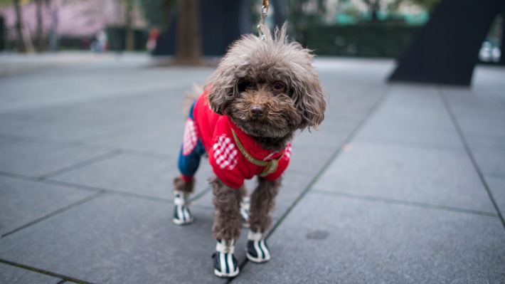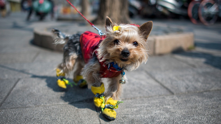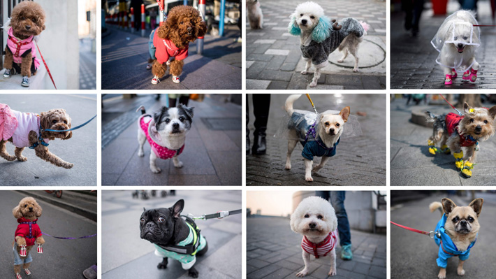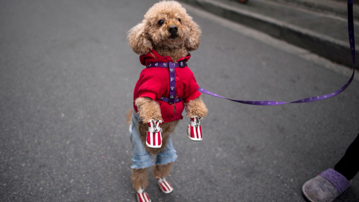 "A los propietarios les gusta vestir a sus animales con elegancia, exactamente como lo harían con sus hijos", comenta Huang, una señora que pasea a dos caniches café en un coche de guagua en pleno centro de la capital económica china. Uno lleva una humita rosada y el otro, una azul.