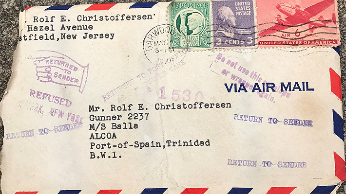 La mujer, Virginia, envió la carta el 4 de mayo de 1945 desde Nueva Jersey, donde residían, al navío de su marido atracado en Puerto España (Trinidad y Tobago), pero la misiva nunca llegó y fue remitida a su origen.