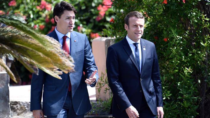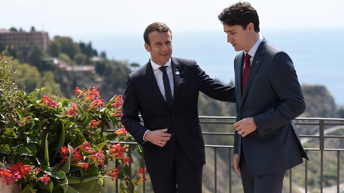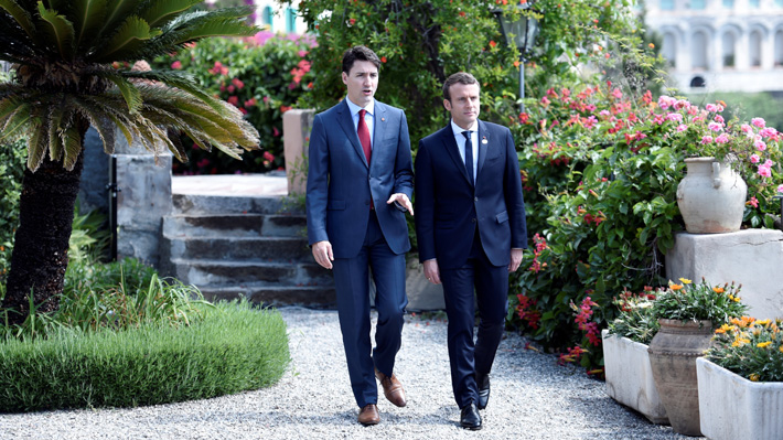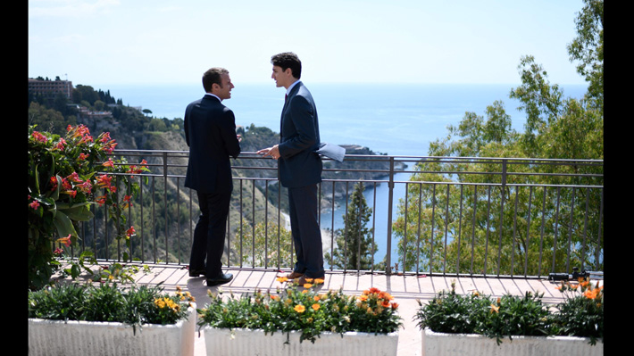 Teniendo como escenario Sicilia, los dos líderes aparecen dando un paseo por un jardín en un día soleado. Y sus guardaespaldas -tal como si se tratara de adolescentes que siguen a los populares del colegio-, caminan atrás. Trudeau y Macron hablan en francés.