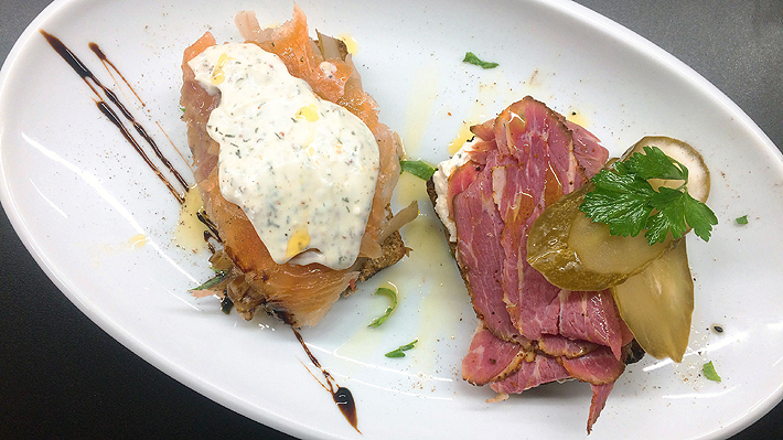 La carta, aunque acotada, le sobra sabor. Está dividida en montaditos, que son para compartir, cazuelas, los platos principales y los postres. La recomendación es pedir platos distintos y compartir para poder probar de todo. Entre lo imperdible de los montaditos está la carne curada ahumada -que la hacen en el mismo restaurante- sobre pan negro, con queso crema, rábano picante, pepinillos en vinagre, hojas verdes, y vinagreta de miel y mostaza; o también el montadito de paté de conejo con confitura de ciruelas sobre pan de campo.