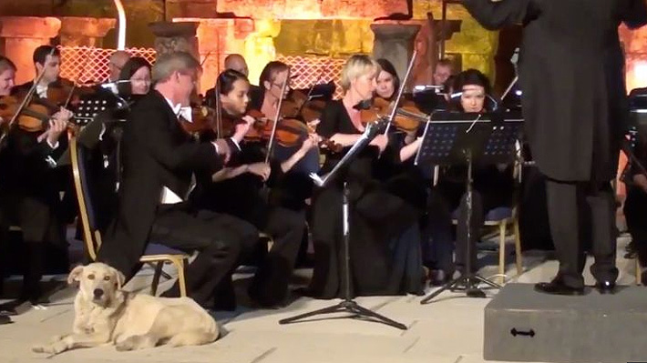 La escena tuvo lugar la semana pasada cerca de Esmira, en el oeste de Turquía. Mientras la Orquesta de Cámara de Viena dirigida por el sueco Ola Rudner tocaba la cuarta sinfonía de Mendelssohn, el perro subió al escenario, aparentemente atraído por la música.