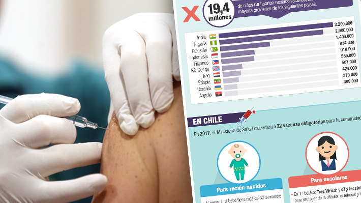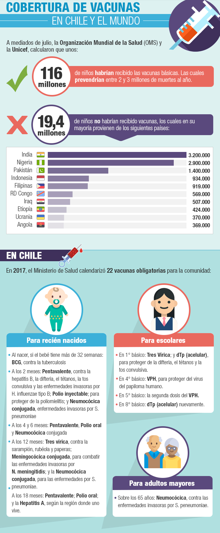El 14,3% de los niños en el mundo no reciben las vacunas necesarias para prevenir enfermedades y, según datos de la OMS, en Chile la cobertura en las principales campañas supera el 90%.