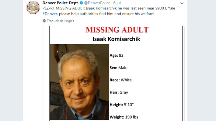 El hecho ocurrió en Denver, donde Isaak Komisarchik, de 82 años, fue visto por última vez en piyama, cerca de un centro de salud. Según comentó a la prensa local su hija, Yelena Komisarchik, el anciano fue a su oficina a buscar documentos y fotografías, antes de desaparecer. Además, agregó que era frecuente que se desorientara, debido a que padecía de demencia por lo que no podía dar largas caminatas.