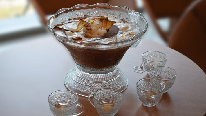 PreparaciónEn una ponchera agregar todos los ingredientes y revolver para integrarlos. Para enfriar lentamente, colocar un bloque grande de hielo en el centro de la ponchera. Decorar con triángulos de piña deshidratada, canela en rama y medialunas de naranja. Rallar nuez moscada al final para aromatizar.