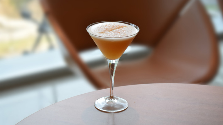 Batir todos los ingredientes en una coctelera sin hielo por 8 segundos. Agregar mucho hielo y volver a batir por 20 segundos. Colar sobre una copa de martini previamente enfriada y decorar con 3 gotas de amargo de durazno sobre el cóctel.
