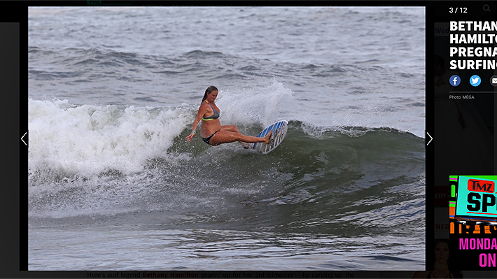 Crédito: TMZ / Pantallazo"¡Qué osada!", pueden pensar muchos. Sin embargo, no es la primera vez que lo hace, ya que cuando esperaba a su primogénito surfeó hasta un mes antes de que naciera.