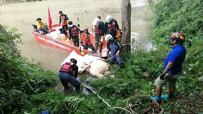 la corriente arrastró este lunes el cuerpo de uno de los paquidermos a la orilla, lo que permitió sacarlo del río Tha Dan.