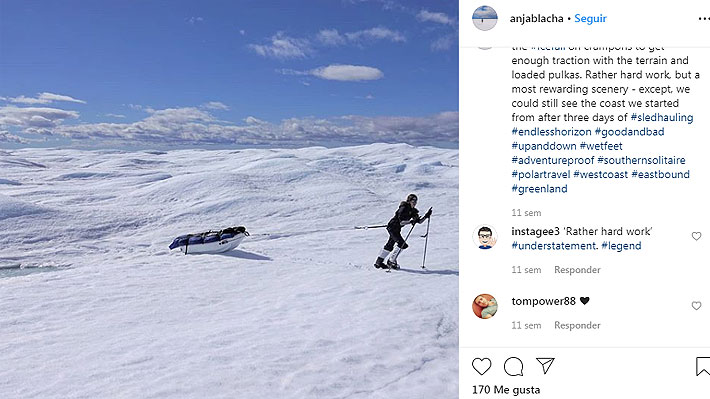 describe a diario su hazaña en Instagram y a través de un blog de video. Allí muestra, por ejemplo, las dificultades que tiene de avanzar con el trineo cargado de provisiones y su tienda de campaña en medio de una fuertísima nevada.