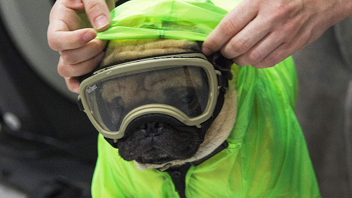 Dos pares de botas, unas gafas de protección y un pequeño impermeable color verde son el uniforme de este can llamado