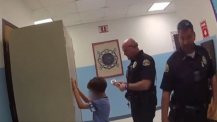 video que salió a la luz pública esta semana, donde el menor está sentado, muy calmado, y llega la Policía a arrestarlo, con la dificultad de ponerle las esposas porque son demasiado grandes.