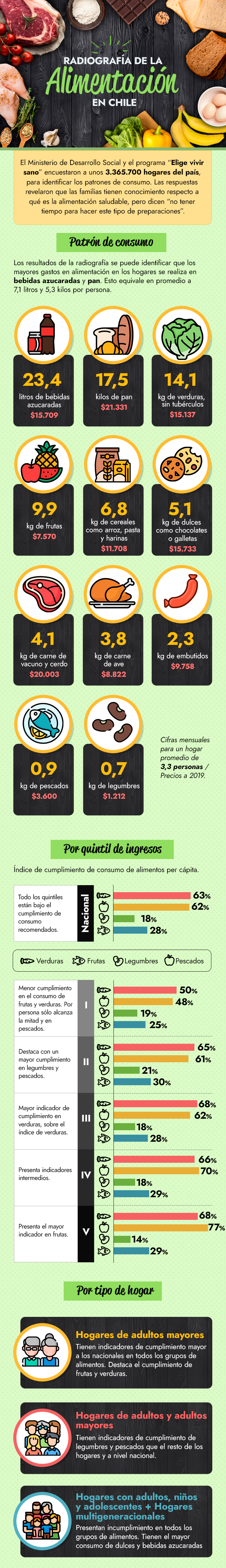 Sin embargo, el estudio también arrojó que existe una deficiencia en la dieta de los chilenos debido a que existe una brecha económica con respecto a la compra de ciertos alimentos. Un ejemplo de esto es que el primer quintil de ingresos es el que tiene menor consumo de frutas y verduras. Por el contrario, los quintiles tercero y quinto son los que más comen de estas categorías.