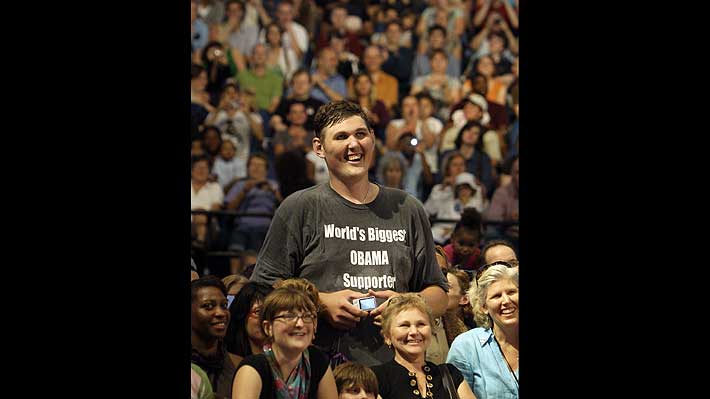 El hombre, que lucía una camiseta que decía "El partidario de Obama más grande del mundo" y sobresalía sobre la multitud de simpatizantes congregados, intercambió un apretón de manos con el entonces presidente demócrata.