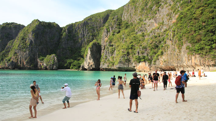 "Hermoso, el sitio más lindo que he visto en Tailandia", dice Facundo, un turista argentino, justo antes de bajar a la playa de arena blanca y aguas turquesas situada en la isla de Phi Phi Leh, en el suroeste de Tailandia.