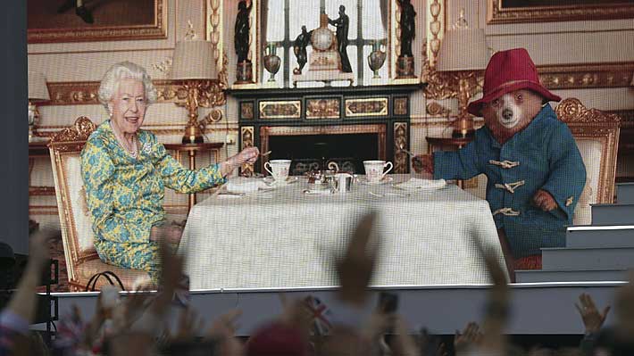 imágenes en las que se le vio tomar el té con el famoso personaje de Paddington Bear, en una sala del palacio de Buckingham.