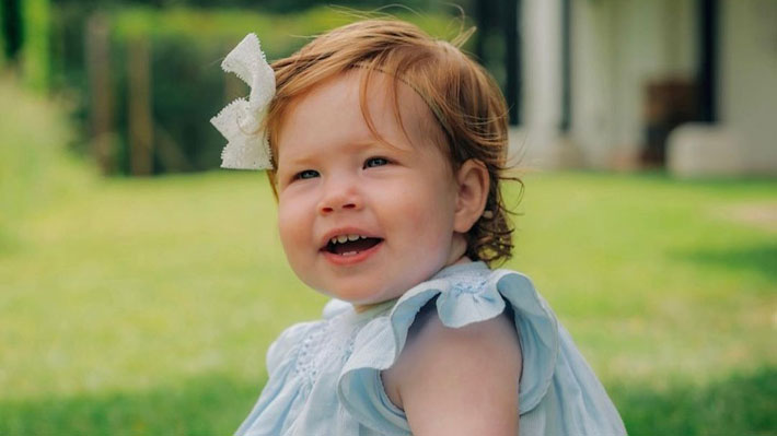 La pequeña aparece sentada en la hierba en los jardines del castillo de Windsor, una de las residencias oficiales de la reina Isabel II, con un vestido celeste y un lazo blanco en el pelo.