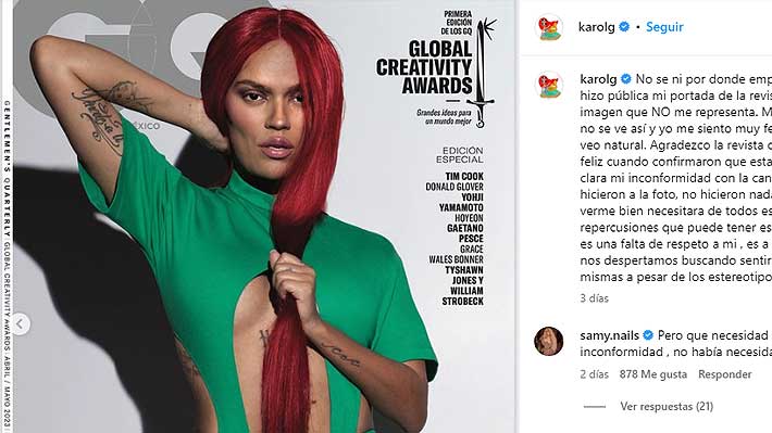 "No sé ni por dónde empezar este mensaje. Hoy se hizo pública mi portada de la revista GQ, una portada con una imagen que NO me representa. Mi cara no se ve así, mi cuerpo no se ve así y yo me siento muy feliz y cómoda con cómo me veo natural", dijo la cantante colombiana a través de su Instagram.