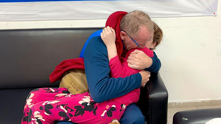 Tom Hand abraza a su hija Emily tras ser liberada por Hamás.