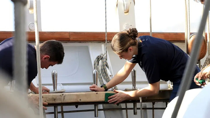 En el vídeo, de nueve minutos, se aprecia con detalle las labores desempeñadas por la heredera de la Corona junto a sus compañeros, desde la subida por la arboladura de la nave para trabajar con las velas a gran altura hasta tareas de limpieza en la embarcación.